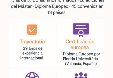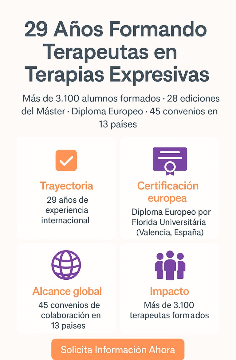 En nuestro máster acreditado por el Instituto IASE y con Diploma Europeo emitido por Florida Universitària (España), formarás parte de una comunidad internacional de profesionales creativos comprometidos con la transformación personal y social.